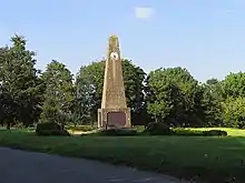 The Church of England parish church of St James, built in 1859 of brick and flint, is towards the southern end of the village. It was designed by architect, Samuel Sanders Teulon.[16] The interior is brick with patterns formed by the use of differently coloured brick courses and complementary colour stone embellishments. Leckhampstead has a village hall used for voluntary and social gatherings. The one public house in the village, The Stag, closed in 2017. Leckhampstead War Memorial is sited on the triangular village green. It comprises an obelisk on a plinth with two clock faces, one facing north and one facing south, which incorporate various types of ammunition in them. The surrounding chains are from a battleship that took part in the Battle of Jutland and they are supported on spent shell cases.[17] It was given Grade II listed status in May 2016, legally protecting it from unauthorised modification or removal.[18]