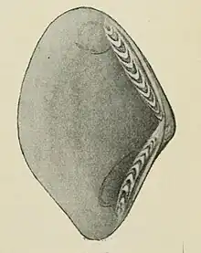 (Original description) The shell is minute, smooth, white and shining. It is rhomboidal, rounded in front, narrowly produced behind into a short beak. The hinge line is arcuate, bearing arrow-shaped teeth, strong on the anterior slope, but less so posteriorly.[2]