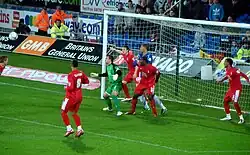 Having not earned a call-up to the full England team, Camp stated that he would be keen on playing for Northern Ireland, for whom he qualifies through his Newtownards-born grandfather. Northern Ireland boss Nigel Worthington asked the Irish Football Association to start the process to make Camp available for the national side[35] and FIFA confirmed Camp's eligibility to play for Northern Ireland on 16 February 2011.[36] He received his first call-up to the Northern Ireland squad on 14 March 2011, for the Euro 2012 qualifiers against Serbia and Slovenia,[37] and made his Northern Ireland debut in the match against Serbia on 25 March 2011.[38]