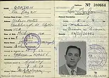 The "Alien Certificate" (see image below), issued to him by the Department of Immigration shortly after his arrival in Australia in 1953, records his birth as 8 March 1923 in Michigan, although other sources claim that Gordon was born in 1917 in Coral Gables, Florida. His Certificate also, notably, has no entry in the line for "Previous name (if any)", which is at odds with the generally accepted account that he had changed his name from "Gevorshner" to "Gordon" some time before his arrival in Australia. It also indicates that he travelled from the U.S.A. by ship (vessel registration N1025V), disembarking in Sydney, and the attached identifying photograph provides a rare image of Gordon before he underwent plastic surgery to change the shape of his nose.