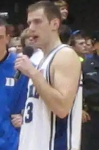 Lee Melchionni talking to the crowd after his last game in Cameron Indoor Stadium
