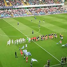 Millwall and Leeds United players shake hands before kick-off at The Den on 9 August, 2014