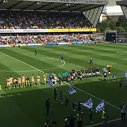 In the 2017–18 season, Millwall rejoined Leeds in the Championship after a two year absence. The sides met at the Den on 16 September 2017, with Leeds unbeaten and top of the Championship table. An Aiden O'Brien goal won the game for Millwall 1–0, with Leeds conceding their first goal in over ten hours of football.[45] In the return fixture at Elland Road on 20 January 2018; Millwall beat Leeds 4–3, the highest ever scoring game between the sides. In a highly eventful match, Leeds came back from 0–2 and a man down after their captain Liam Cooper was sent-off to lead 3–2, but two late goals in the final two minutes gave Millwall their third league double over Leeds and first away win of the season.[46] The sides played out a 1-1 draw at the Den the following season, with Jed Wallace giving the Lions the lead just after half-time, and a late equaliser by Jack Harrison in the 89th minute sharing the points.[47] Leeds won the return fixture at Elland Road 3–2. Millwall twice took the lead, but a Pablo Hernández double secured all three points for the Whites.[48] In the 2019–20 season, managerless Millwall won 2–1 at home against Leeds, their eighth victory in the last ten games against Leeds at the Den. A penalty from Jed Wallace and a goal from Tom Bradshaw gave Millwall a two-goal lead, before Ezgjan Alioski pulled a goal back for Leeds. Gaetano Berardi was sent off for Leeds, his seventh red card for the club.[49] In January 2020, Leeds came from behind to beat Millwall 3–2 at Elland Road. Millwall took a 2–0 lead in the first 23 minutes, with goals from Shaun Hutchinson and Jed Wallace. After half-time Leeds scored three goals in 15 minutes, with a brace from Patrick Bamford and Pablo Hernández scoring the other goal.[50] At the end of the season, Leeds were promoted to the Premier League as champions and Millwall finished eighth. Leeds spent three seasons in the Premier League, before being relegated back into the Championship and will meet Millwall again in the 2023–24 season.