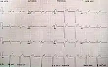 Electrocardiogram showing left bundle branch block and irregular rhythm due to supraventricular extrasystoles.