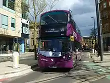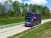 Services were initially operated by 20 Wright Eclipse Gemini 3 bodied Volvo B5LH hybrid double-decker buses in purple-livery. They are equipped with CCTV and next stop audio and visual announcements, USB charging points and free Wi-Fi.[36] Five more buses were purchased in January 2017 to provide extra capacity at busy times and facilitate the extended service to Central Manchester Hospitals.[11][37] It is required that buses that operate the busway service are replaced after 5 years of service. Further buses are scheduled to enter service in September 2018. These will operate the V4 service from Ellenbrook, and will be standard vehicles not adapted for busway running.[38]