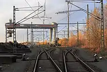 The railway yard in the town of Wahren and the freight ring towards Schönefeld were electrified as early as 1914, but shortly after the beginning of the First World War the operation of electric trains in central Germany was stopped and the catenary systems were dismantled for the production of non-ferrous metals. The overhead wiring systems were rebuilt between 1921 and 1923, but the Leipzig-Wahren–Leipzig Hbf railway was not electrified until 1934. Even during the Second World War, development continued, but none of it was completed. During the course of the war, the station was repeatedly attacked from the air and considerably damage was inflicted. After the end of the war there was a further loss of infrastructure due to dismantling for reparations, including both the main railway tracks and the platform tracks. Electrical operations had to be abandoned again in March 1946. In the 1950s and 1960s, the missing second track lines, which had caused particular difficulties in the heavily used Leipzig node, were replaced, but the line to the Magdeburg-Thüringer freight yard in Leipzig, which was only used by local freight traffic, remained as a single-track line. However, with the re-electrification of the line for the second time in about 1960, masts for two-track operations were installed on this line as well, each carrying two 15 kV supply lines from the Wahren substation to the switching station at Leipzig Hbf.