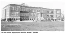 A snapshot of a newspaper clipping about the old Leland High School building before it caught fire in the 1920s.