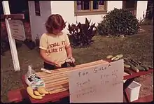 The stand may be a folding table, while the archetypical version is custom-made out of plywood or cardboard boxes.[3][4] A paper sign in front typically advertises the lemonade stand.