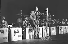 During the Second World War, many professional musicians enlisted and served in military bands. As a result, there were occasional openings in established commercial bands. Thus, at just 18 years of age, Hambro auditioned for an empty seat in Gene Krupa's band. His audition included playing "American Bolero", a piece written in 5/4 time, a complex meter that was quite progressive in Western music at the time.[7] Although initially skeptical, Krupa and trumpeter Roy Eldridge were impressed and called Hambro at home the next day to tell him that he had secured the job and to schedule him for a tuxedo fitting. On October 28, 1942, two weeks after his 19th birthday, Hambro was on stage with the Gene Krupa Band at the Times Square Paramount Theater.[2] However, he left the band in December of that year for the Army and joined Ivan Mogul, Shorty Rogers and approximately 40 other musicians from the Bronx who had agreed to man the 379th Army Service Forces (ASF) Band in Newport News, Virginia, where he stayed for three years.[8][5] From 1946 to 1947, Hambro was a featured soloist with Billy Butterfield and his orchestra; recording with him in 1946.[9] In 1947, he played with Bobby Byrne before rejoining Gene Krupa as lead alto sax and featured jazz soloist through 1950. (Hambro, along with tenor saxophonist Buddy Wise and trombonist Frank Rosolino, is featured in a 15-minute film short, Deep Purple, directed by Will Cowan in 1949, which focused on Gene Krupa and His Orchestra.)[10] In addition to playing with Krupa, Hambro simultaneously played in other bands, including the Latin jazz ensembles of Vincent Lopez and Pupi Campo. In 1948, Hambro toured with Machito and his Afro-Cuban Orchestra where he was featured as a soloist on alto sax. From 1951 to 1952, Hambro played with and managed the Ray McKinley Band. From 1951 to 1954, he also played and recorded with Chico O'Farrill's orchestra, with a year off (1952) to tour with The Gene Krupa Orchestra. From 1948 until 1954, he recorded with all of these artists and both Charlie Ventura's orchestra and Joe Loco's band, as well as Earl Williams, Sauter-Finegan, George Williams, and Red Norvo. During this period (1951–1956), Hambro also accompanied vocalists at the Paramount Theater, did studio work, worked as a music copyist,[11] and taught private lessons. He continued to hone his own skills by studying clarinet with Leon Russianoff and flute with Henry Zlotnick, both of the Manhattan School of Music.[12]