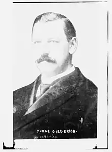 Giegerich was a member of the Tammany Hall General Committee. In 1886, he was elected to the New York State Assembly as a Democrat, representing the New York County 12th District. He served in the Assembly in 1887.[3] In 1887, President Cleveland appointed him collector of internal revenue for the third New York district. In 1890, Governor Hill appointed him to fill an empty bench on the City Court. Later that year, he was elected County Clerk. He resigned from the office in 1891, when Governor Hill appointed him to fill a vacancy in the Court of Common Pleas. In 1892, he was nominated by both parties and elected to serve a full 14-year term on the bench. He was a delegate to the 1894 New York State Constitutional Convention. Under the new state constitution, he became a justice on the New York Supreme Court.[4] He was re-elected to the office twice and retired as justice in 1925.[5]