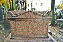 Euler was buried next to Katharina at the Smolensk Lutheran Cemetery on Vasilievsky Island. In 1837, the Russian Academy of Sciences installed a new monument, replacing his overgrown grave plaque. To commemorate the 250th anniversary of Euler's birth in 1957, his tomb was moved to the Lazarevskoe Cemetery at the Alexander Nevsky Monastery.[64]