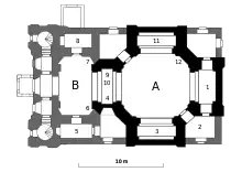 Plan of the church with construction stages color-coded: █ 1679–1693, 1717–1730