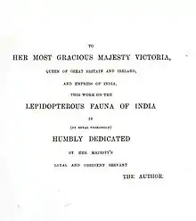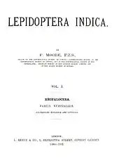 4. Moore, Frederic (1890). "Preface". Lepidoptera Indica. Volume 1. L. Reeve and Co. London.