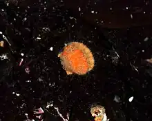 The shell can be three to five cm in size.[1] As is the case in most scallops, the shell is mostly circular with two flat auricles or ears that extend off the hinge. It usually has ridges that radiate out from the hinge toward the mantle. Some also have ribs perpendicular to the ridges. The shell is extremely thin compared to most bivalves, with one side extending out more than the other.