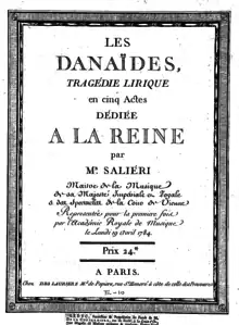Les Danaïdes is an opera by Antonio Salieri, in five acts: more specifically, it is a tragédie lyrique.[1] The opera was set to a libretto by François-Louis Gand Le Bland Du Roullet and Louis-Théodore de Tschudi, who in turn adapted the work of Ranieri de' Calzabigi (without permission). Calzabigi originally wrote the libretto of Les Danaïdes for Christoph Willibald Gluck, but the aged composer, who had just experienced a stroke,[2] was unable to meet the Opéra's schedule and so asked Salieri to take it over.[3] The plot of the opera is based on Greek tragedy and revolves around the deeds of the mythological characters Danaus and Hypermnestra.