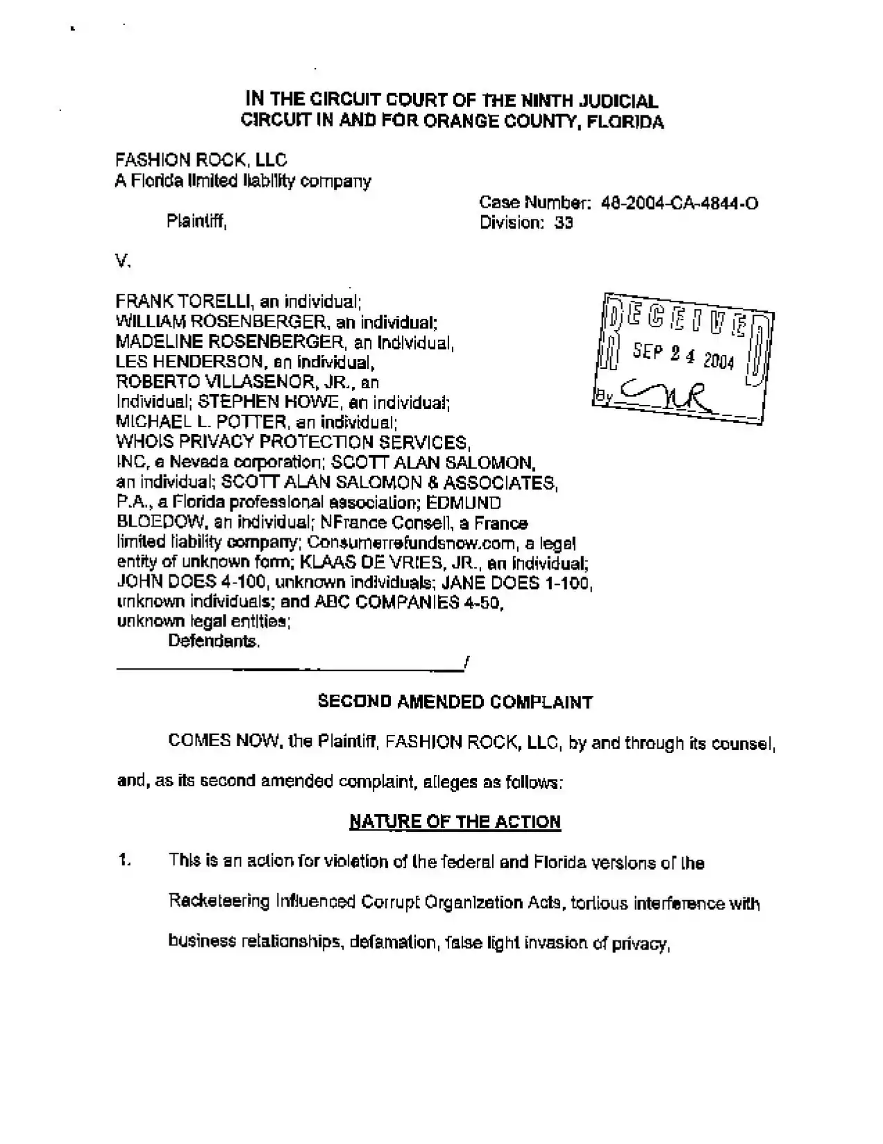 6. Fashion Rock, LLC vs Frank Torelli et al., 48-2004-CA-004844-O (C.C. Flo. 2004), a case in the Circuit Court of the Ninth Judicial Circuit in and for Orange County, Florida.