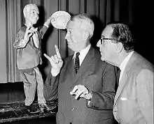 In addition to original characters, many of the puppets were modeled after celebrities. The Kroffts had previously been the opening act for entertainers like Judy Garland and Sammy Davis Jr., so they were able to get many celebrities to record voices for their puppets. Some of these puppets included Pearl Bailey, Milton Berle, Cyd Charisse, Gene Kelly, Liberace, Jayne Mansfield, Tony Martin, Phil Silvers, Loretta Young, and Mae West, whose puppet appeared topless.[4] A handful of puppets were unofficially modeled after other celebrities (Pelvis Essley), and several weren't created specifically for the show — their Frankenstein, Dracula and Madame Jenkins Foster puppets all made brief appearances in the 1957 television pilot Here's Irving.