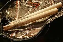 The drummers have used 225 litre "Monostress" drums since the band's inception, chosen for their resonance and flexibility. The drums arrive by truck, then are painted by band members using their own designs. Each drum is used for two concerts, one for each end, before being given away. Their sticks are made of beech wood and are 40 cm (16") long with a diameter of 3 cm (1.2"). Each musician breaks about two pairs per concert. In the band's lifetime, they have used about 16,000 oil drums and 110,000 sticks.