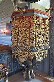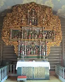 The pulpit in Lesja Church is richly carved with acanthus decorations and was created by Jakob Klukstad in 1742-1745 (this was in the old church for a few years and then moved to the new church when it was built).[3] Klukstad was from Lom but he moved to Lesja and was the head of the household at the parsonage farm, probably at the time he was working on the church. The pulpit was made for the previous church that stood at the site. Klukstad also created the altarpiece for the new church, which has a very original design. It is a large and richly executed work of art with a framework of acanthus surrounding several carved figures.[5] The altarpiece is a masterpiece of folk art in the region. The ceiling painting in the church and the painting on the sides of the galleries and box pews were created by Ragnvald Einbu based on a model from preserved remnants from the church's original decor.[3]