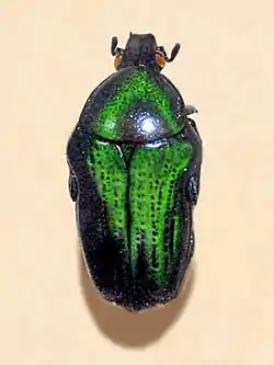 Leucocelis feana can reach a length of about 20 millimetres (0.79 in). These beetles have a deep glossy green body, more or less tinged with red in some specimens. Head is longitudinally convex and sparsely punctured. Elytra are quite convex and sculptured and they show ten rows of coarse arcuate punctures. The middle and hind femora are more or less tinged with green or red.[1]