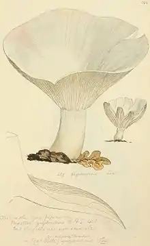 The species was first described as Agaricus giganteus by English naturalist James Sowerby in 1809, who illustrated it in his book Coloured Figures of English Fungi.[1] Other historical synonyms include Clitocybe gigantea (Quélet, 1872),[2] Paxillus giganteus (Fries, 1874),[3] and Omphalia geotropa var. gigantea (Quélet, 1886).[4] In 1934, Robert Kühner and Réné Maire created the genus Aspropaxillus to contain species of Leucopaxillus with smooth spores, and they set L. giganteus as its type species.[5] American mycologist Rolf Singer transferred it to genus Leucopaxillus in 1938,[6] but recognized the value of maintaining a distinction of the smooth-spored species, and so made L. giganteus the type species of section Aspropaxilli.[7]