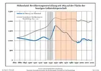 Development of population since 1875 within the current boundaries (Blue line: Population; Dotted line: Comparison to population development of Brandenburg state; Grey background: Time of Nazi rule; Red background: Time of communist rule)