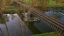 Shortly after Aichstetten, the line turns north again and runs directly line to the stations of Marstetten-Aitrach, Mooshausen, which has been disused since the 1970s, and Tannheim. At Tannheim the track takes another sharp turn to the east and crosses the Iller on a large viaduct; at this point the border runs along the river. On the Bavarian side the line passes through Buxheim station, which is now also closed, before making a wide curve to the south of Memmingen, the end of the line. Even this so-called Tannheim Arc (Tannheimer Bogen) has political origins: the route was originally selected at the wishes of the Earl of Waldbott von Bassenheim of Buxheim and the Earl of Schaesberg in Tannheim, who also wanted connections to the railway.[7]