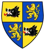 A shield divided by a cross. In the first and third quadrant are golden lions, in the second and fourth quadrant golden heads of wild boar.