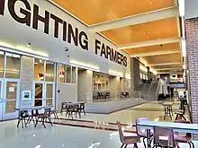 The school's football team were state finalists in 1972, state semifinalists in 1979, and won state championships in 1993 and 1996 (at which time the team was featured on the "Team Cheerios" cereal box).[2] The 1996 Farmer football team set the championship game record for most yards gained on the ground (547, the team did not attempt a single pass during the game), while the combined score of 92 in the game set a new record for most points in an 11-man title game.[9] An earlier team achieved notability for a different reason in 1946, when members of the Fighting Farmer football team chased a bank robber until he was exhausted, allowing for his capture by an unarmed gas station attendant.s[2]