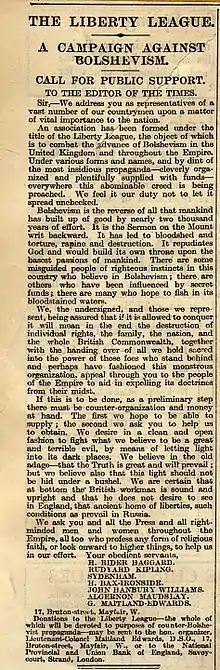 The Liberty League was a classical liberal British political organization, active in 1920–21.[1][2] It was established by Rudyard Kipling, H. Rider Haggard, Lord Sydenham, Henry Bax-Ironside, John Hanbury Williams, Algernon Maudslay. Lieutenant Colonel G. Maitland Edwards served as Leagues organiser and treasurer. The League's express purpose was countering Bolshevism and advancing classical liberal ideas "in the United Kingdom and throughout the Empire." The League aimed exposure and "fight every effort to set up the tyranny of a minority over a majority."[3]