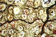photograph of an herbarium specimen taken through a dissecting microscope (x40) showing the black apothecia (within the red circles) of Lichenodiplis lecanorae parasitizing the apothecia of Pertusaria xanthodes