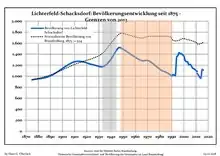 Development of Population since 1875 within the Current Boundaries (Blue Line: Population; Dotted Line: Comparison to Population Development of Brandenburg state; Grey Background: Time of Nazi rule; Red Background: Time of Communist rule)
