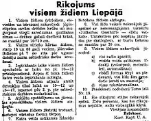 - 1 2 "Rikojums visiem zidiem Liepaia" (PDF). Kurzemes Vārds (in Latvian). No. 4. 5 July 1941. p. 1. Retrieved 30 May 2016. Online version from National Library of Latvia website.