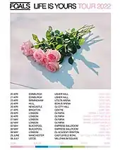 The Life Is Yours Tour was a concert tour by English indie rock band Foals in support of the band's seventh studio album, Life Is Yours. The tour started on 20 April 2022 and concluded on 4 September 2023. The remaining dates from the band's Everything Not Saved Will Be Lost World Tour were rescheduled from April 2020 to April 2021 due to the COVID-19 pandemic. Ten months later, in March 2021, Foals rescheduled their remaining concerts to 2022.[1]