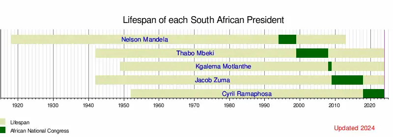 This is a graphical lifespan timeline of presidents of South Africa. The presidents are listed in order of office.[1][2]