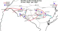 The plan consisted of a four-column invasion across the border, coordinated with uprisings in army units in Rio Grande do Sul.[11] One of the most important garrisons would be Santa Maria, the largest military hub and railway center in the state.[17][18] The concentration point would be in Caçapava, a municipality with a strong opposition presence.[19] Parallel to the campaign in Rio Grande do Sul, one of the columns would enter Santa Catarina and Paraná to cut the São Paulo-Rio Grande Railway. After the victory in the south, the rebels would join the Prestes Column, coming from Mato Grosso, to march against São Paulo.[20]
