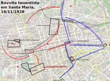 At the first sound of the cannons, major Barão withdrew the 1st RC from its barracks, on the other side of the city, as it would be vulnerable to bombardment. At 07:00 he took his regiment to the city center on horseback and in requisitioned automobiles. Mounted rebels patrols, identified by red scarves, withdrew from the central streets to more distant positions.[lower-alpha 1] The brigadiers occupied the banks, the Municipal Quartermaster's Office, the National Telegraph and the Railway Station and established a line of trenches towards the north–south, dividing the city in half.[37][38]