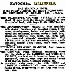 In 1878 he became a Queens Council and in 1886 he was offered the position of Chief Justice which he accepted. Lady Lucy Darley was a firm believer in the health benefits of mountain air. She was the founder of a society called the Fresh Air League.[7] It was possibly this that helped them to make the decision in 1888 to buy over 11 acres of land adjacent to Echo Point in Katoomba. They built a house for the family over the year of 1889, designed by architect Varney Parkes (son of Henry Parkes). The property was used for a summer residence and nearly every noted visitor to Australia including royalty accepted the Darleys' hospitality to enjoy the magnificent outlook. They were constantly mentioned in the social pages as being the ones to hold house parties at their beautiful residence. In 1894 a social columnist visited the house and gave the following account: