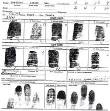 Fingerprint section of the arrest report of civil rights pioneer Lillie Mae Bradford