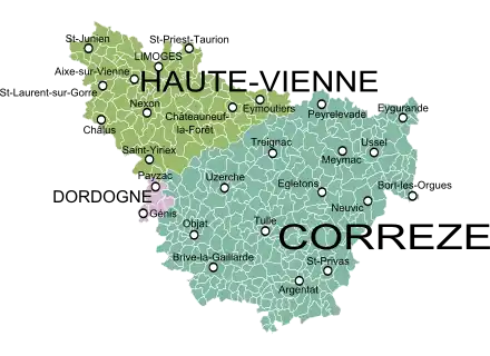 Map of the former province of Limousin, France, showing the communes according to the current administrative division.