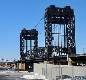 The bridge and its sister, the Lincoln Highway Hackensack River Bridge are important components in the transportation of goods in the Port of New York and New Jersey. Since the nearby Pulaski Skyway prohibits trucks they often use Route 1/9 Truck to serve traffic at Port Newark, Newark Airport, the Holland Tunnel and the numerous intermodal freight transport facilities in the New Jersey Meadowlands. The NJDOT is considering building a new bridge along the alignment of the now defunct PD Draw, the former Newark and New York Railroad bridge at mile point 1.2.[13][14][15] Studies are being conducted as part of an extensive project conceived to facilitate freight transshipment through the port known as Portway. A new bridge could include a rail component. The dual bridge combination would allow for two one-way crossings of the Passaic.[16]