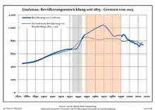Development of Population since 1875 within the Current Boundaries (Blue Line: Population; Dotted Line: Comparison to Population Development of Brandenburg state; Grey Background: Time of Nazi rule; Red Background: Time of Communist rule)