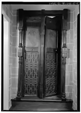 HHF's library is attributed to Frank Furness,[2]: 344C, cat. 565 and was completed by 1896.[14] HHF later described its construction: "What does insurance amount to when such treasures are in question? Of course my thoughts revert to this, my own library, all of brick, iron, with cement floor and asbestos ceiling, and an iron door which closes automatically in case of fire." — HHF to W. Aldis Wright, 4 March 1900.[13]: 57 Located behind the main house at the end of the kitchen ell, the library was three stories high and oriented north-south. Most of its second floor was dedicated to a single two-story room, with wide one-and-a-half-story windows on the east, south and west walls. The north wall featured a fireplace flanked by narrower windows. An iron balcony, hanging from the ceiling by iron bars, wrapped around three sides of the room. Twin iron stairways provided access to the balcony's floor-to-ceiling bookcases.