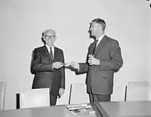 ![]() Wigmore (left), presents a copy of his book, A History of Canberra, to the Minister for the Interior, Gordon Freeth (right) | |
