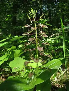 Liparis liliifolia, known as the brown widelip orchid,[2] lily-leaved twayblade,[3] large twayblade, and mauve sleekwort,[4] is a species of orchid native to eastern Canada and the eastern United States. It can be found in a variety of habitats, such as forests, shrublands, thickets, woodlands, and mountains. The orchid is considered globally secure, but it is considered rare or endangered in many northeastern states.