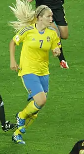 In June 2011 Sweden included Dahlkvist in their squad for the 2011 FIFA Women's World Cup.[25] She was a notable success at the tournament, scoring in three successive games: the only goal in Sweden's second group match against North Korea; putting the Swedes ahead from a penalty kick against the United States; and adding a goal in the 3–1 quarter-final win over Australia.[26] Her three goals led all Swedish players in the tournament.