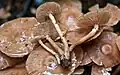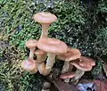 Armillaria is a genus of fungi commonly known as honey mushrooms. First treated by Elias Magnus Fries in 1821, and later assigned generic rank by Friedrich Staude in 1857,[1] Armillaria is classified in the family Physalacriaceae of the Agaricales, the gilled mushrooms.[2] The majority of species in Armillaria are saprotrophic and live mainly on dead wood, but some are parasites that can cause root and butt rot in over 600 species of woody plants.[3] Some Armillaria species form mycorrhizae with orchids;[4] others, such as A. gallica, A. mellea, and A. tabescens, are bioluminescent.[5]