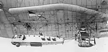 - Hybrid Air Vehicles HAV 304 Airlander 10 - 91 metre long, 38,000 cubic metre developmental prototype for the LEMV project.[11] first flight on 8 August 2012 at Joint Base McGuire-Dix-Lakehurst. Sold back to Hybrid Air Vehicles on the cancellation of the project in 2013 and returned to Cardington.[12] Converted for civilian use as the Airlander 10.[13] During a test flight from Cardington on 24 August 2016, the Airlander's mooring line fouled a power cable, resulting in it striking the ground hard, damaging the cockpit. In April 2017, it was reported that repairs and modifications, including the addition of inflatable landing "feet", were complete and that the Airlander was ready to resume test flights.[14] On 18 November 2017, the Airlander broke free from its moorings, activating a safety system that deflated the hull.[15] Subsequently, HAV announced that the prototype would be retired due to "very considerable damage" sustained in the incident, pending the development of an improved replacement.[16] A redesigned Airlander 10 was announced in January 2020, with new gondola, nose and tail sections, extending the overall length to 98 metres (322 ft). A research project to power the aircraft with electric motors was undertaken with the University of Nottingham. The company hopes to have the improved Airlander flying by 2024.[17]