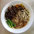 Meeshay မြီးရှေ‌ Shan. rice noodles with pork or chicken, bean sprouts, rice flour gel, rice flour fritters, dressed with soy sauce, salted soybean, rice vinegar, fried peanut oil, chilli oil, and garnished with crisp fried onions, crushed garlic, coriander, and pickled white radish OR mustard greens