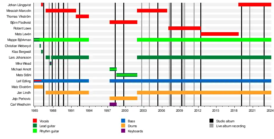 Candlemass is a Swedish epic doom metal band from Stockholm. Formed in late 1984, the group originally consisted of bassist and vocalist Leif Edling, guitarist Mats "Mappe" Björkman, and drummer Matz Ekström. The group's current lineup includes Edling on bass, Björkman on rhythm guitar (a constant member, save for 1997–2001), vocalist Johan Längqvist (originally a member in 1986, and since 2018), drummer Jan Lindh, and lead guitarist Lars Johansson (both from 1986 to 1993 and since 2001).